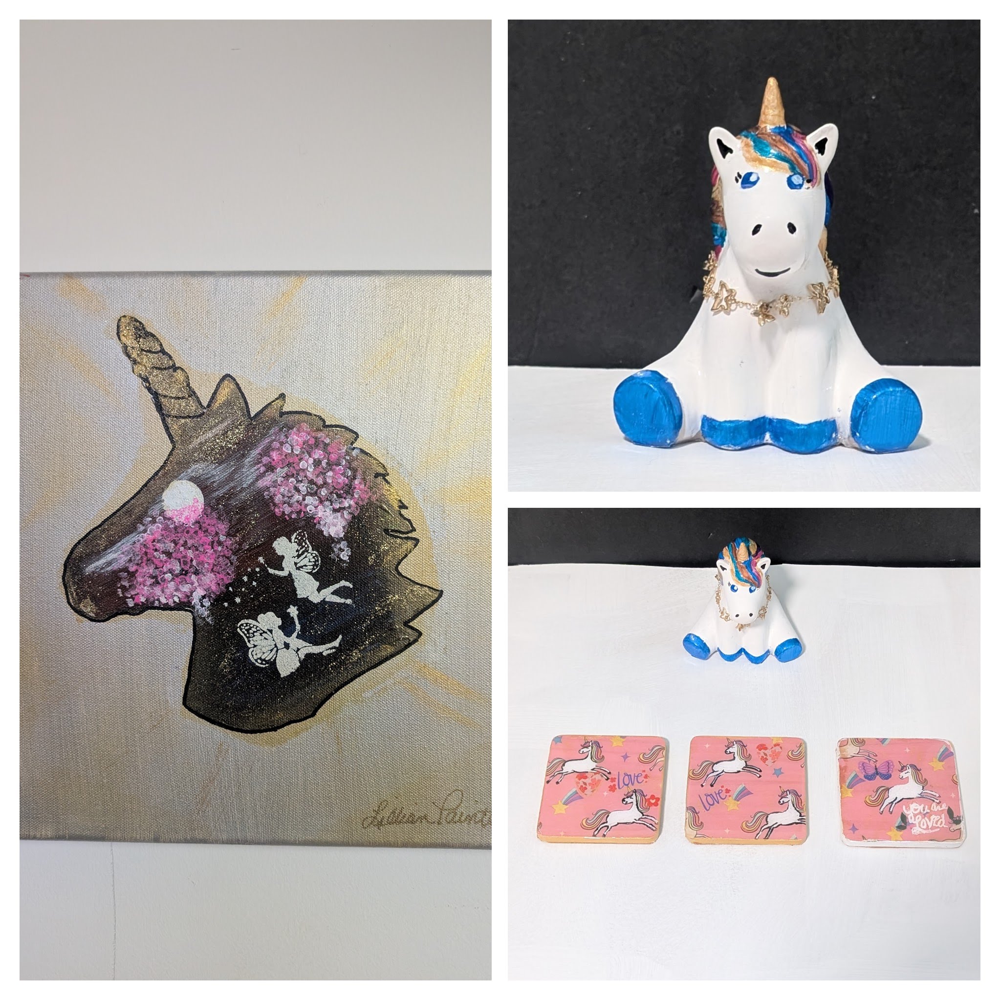 Dreamweaver’s Silhouette” Original Canvas This 12″ x 12″ hand-painted canvas features a striking black unicorn silhouette set against a shimmering metallic silver and gold sunburst. The heart of the unicorn is a garden of textures, featuring delicate pink and white blossoms and two ethereal hand-painted fairies dancing in the stardust. Every brushstroke is designed to bring a sense of magical peace to your sanctuary walls.