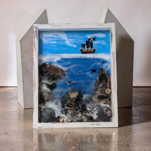 | material | "12"x15" shadow box frame" "joint compound" "resin" "acrylic paint" "clay" "moss" "vinyl details" "crushed shells" "rocks" |