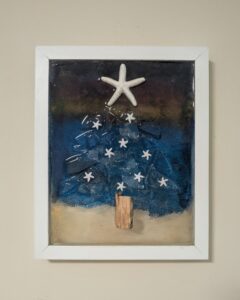 Starfish Night Tree is an 3D art piece features clear cut glass, mini resin stars, and a driftwood trunk, all under a starfish topper and painted sunset sky. Ready to bring serene beach vibes to your wall. It sits in a 8″x10″ picture frame