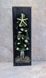 Features green sea glass, real seashells, and a natural starfish topper, bringing the beach to your holiday season. This piece is a one-of-a-kind miniature sculpture bringing holiday.